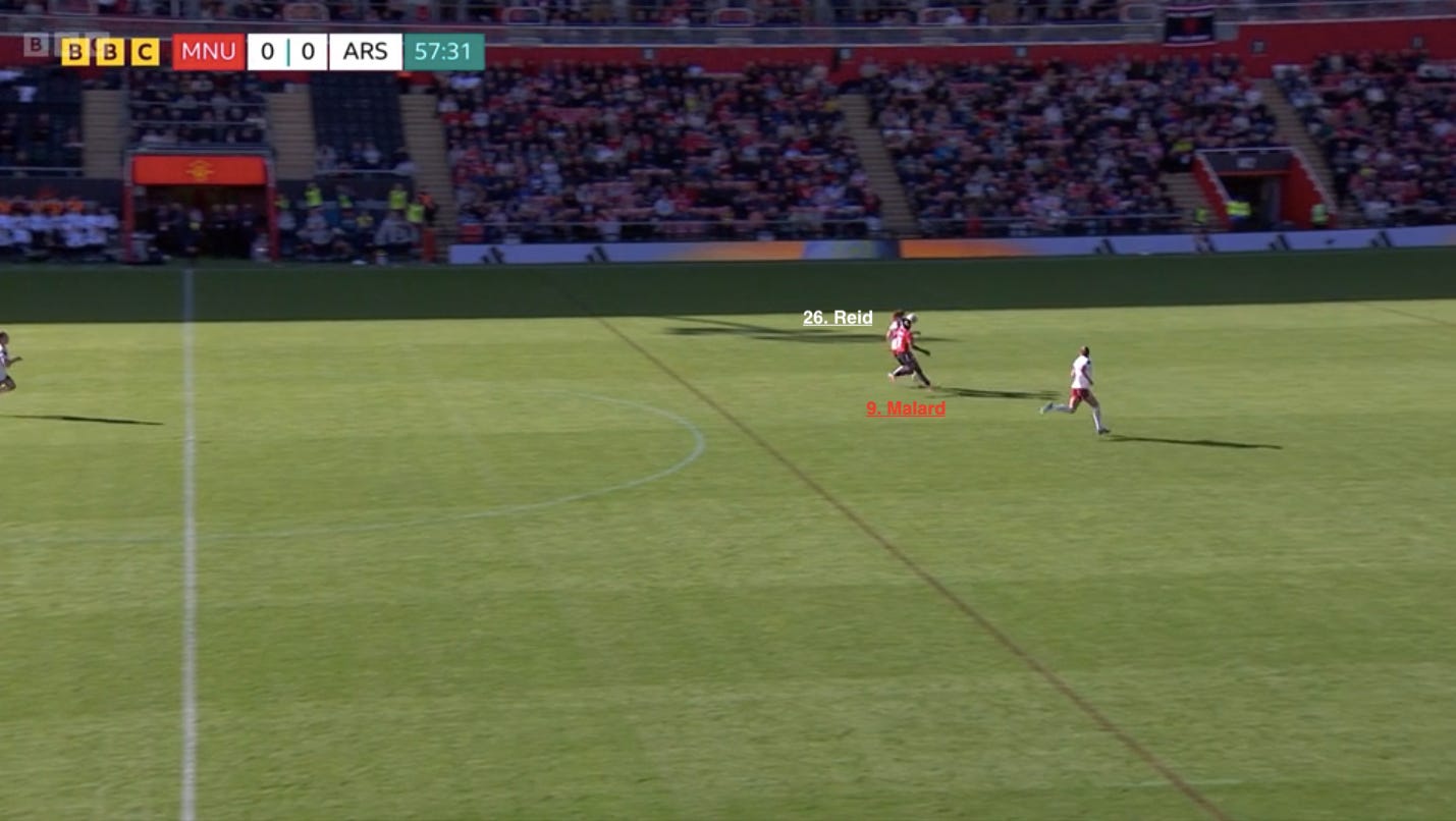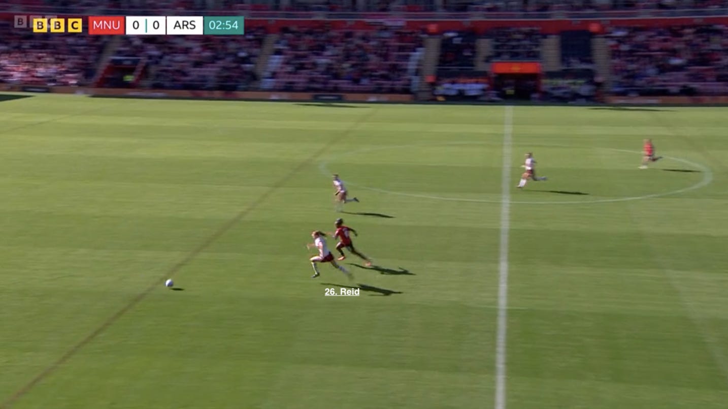 On the day, Manchester United's primary route to goal was to play through balls to Melvine Malard, something that they tried to do from the very first minute. Speaking to The Cutback in the week, Katie McCabe had spoken about Reid's deceptively good pace, saying: “I don't think people realise how fast she is,” and this could be seen in Reid's performance on Sunday. On multiple occasions, United tried to get in behind the Arsenal defence, only for Reid to sweep up on the cover. We can see an example of this in the third minute. Toone looks to play a through ball to Malard, but the France international is beaten by Reid, who can pass back safely to Van Domselaar.