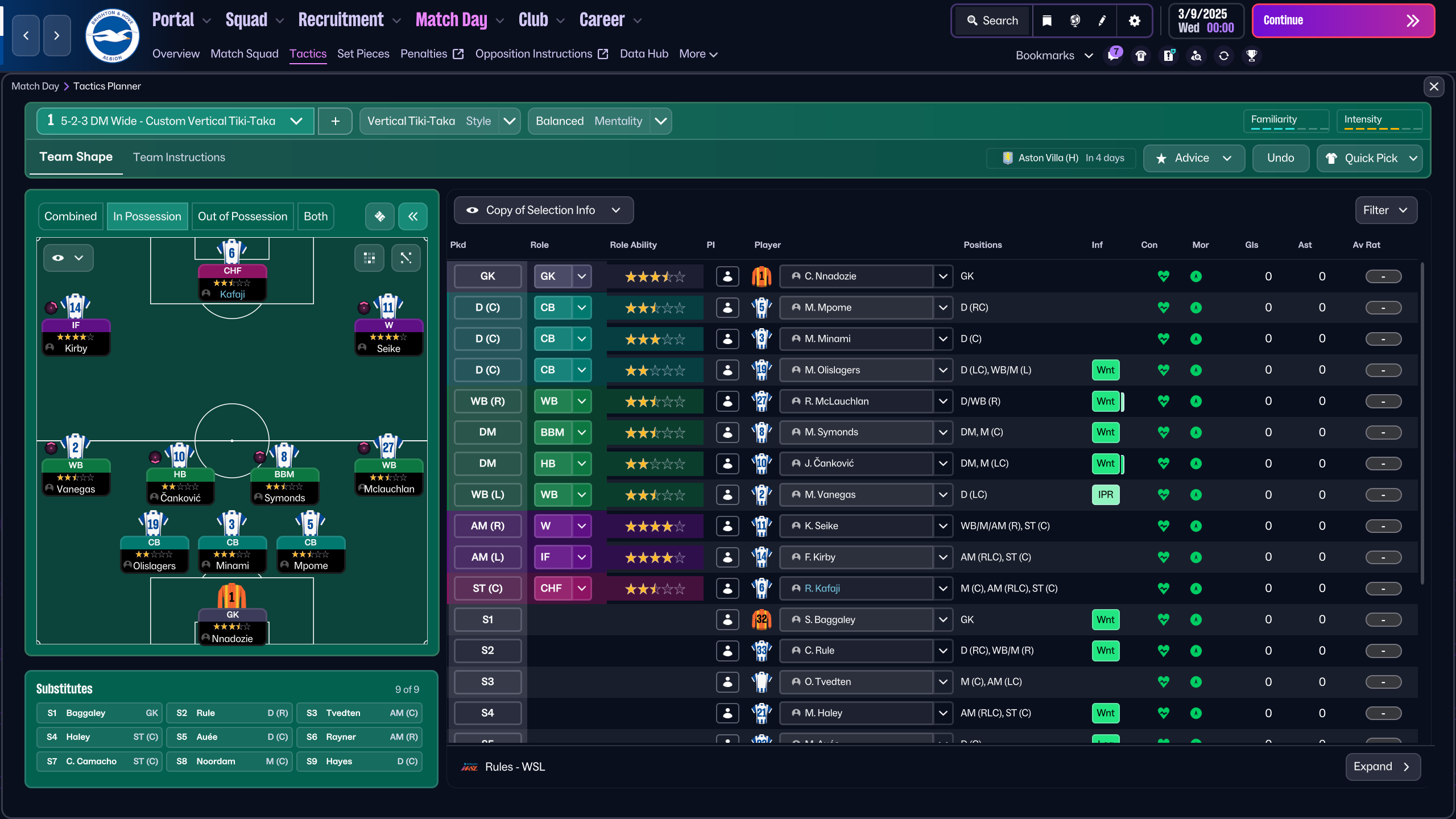 Late in the season, the 3-5-2 provided an alternative attacking shape. With two attacking players (Canković and Kirby) pushing high, two classic wingbacks for width and two forwards complementing each other, one holding up play, one running in behind. Their 1–2 defeat to Liverpool showed the system’s resilience away from home, while the 4–2 win over Arsenal highlighted its attacking potential when transitions clicked, even against top-level opposition.