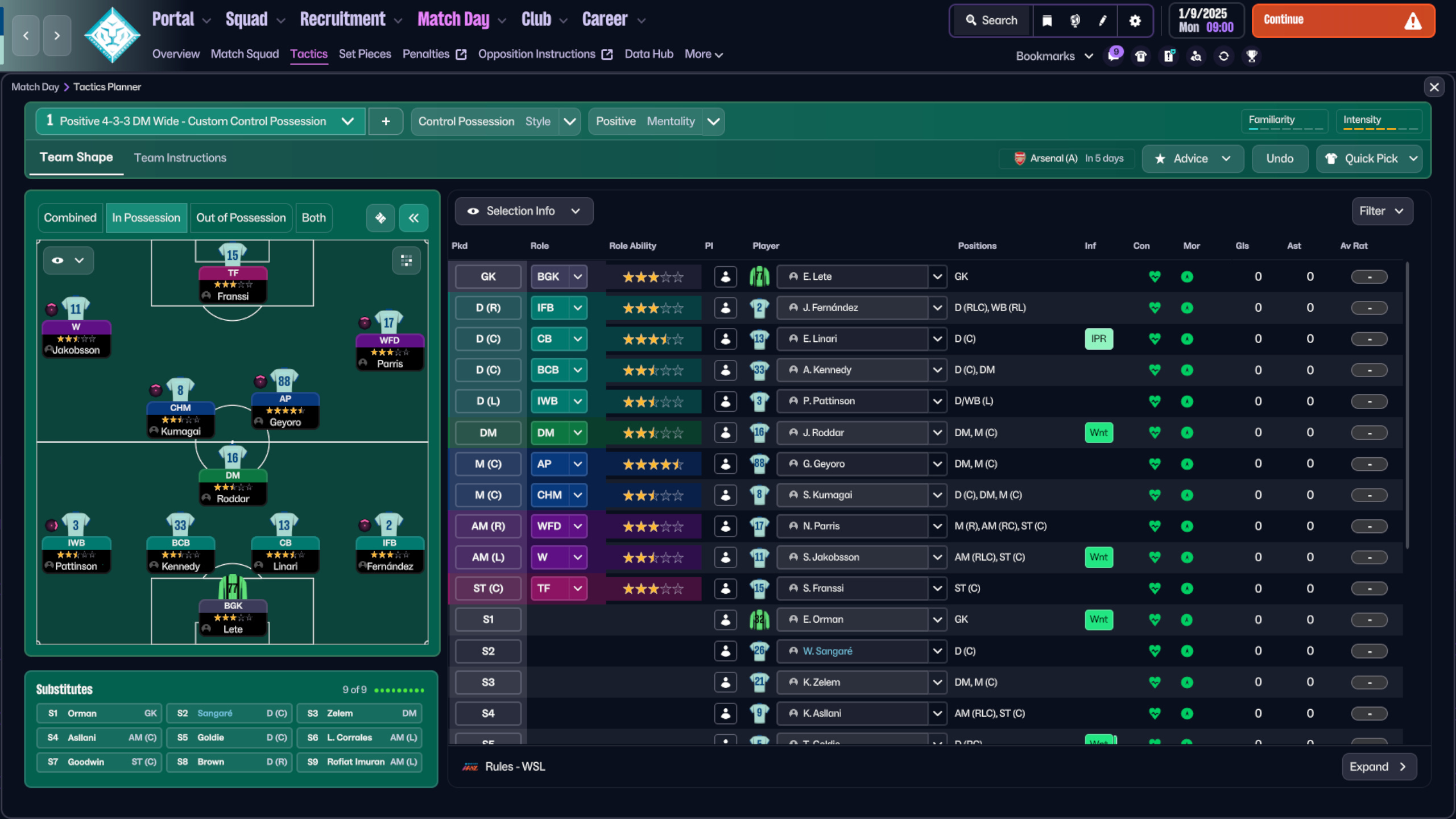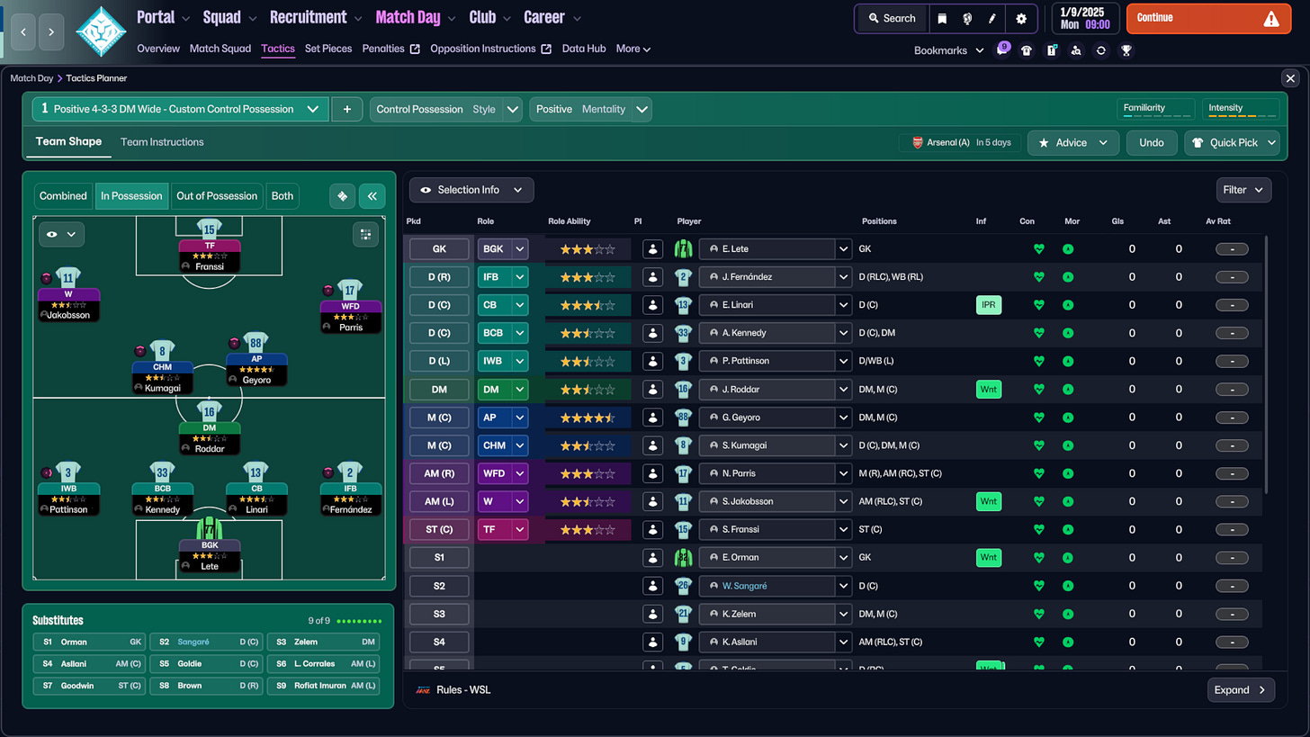 The double pivot remains functional and balanced rather than purely creative. Saki Kumagai or Maria Pérez act as the positional reference, protecting the defence and ensuring circulation stability, while midfielders like Julia Roddar or Geyoro herself bring intensity, forward momentum and pressing energy. Full-backs continue to play a crucial role in providing width and progression, while centrally, the pairing of Alanna Kennedy and Wassa Sangaré offers physicality and structure to a squad still developing.