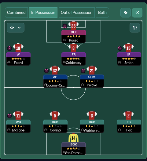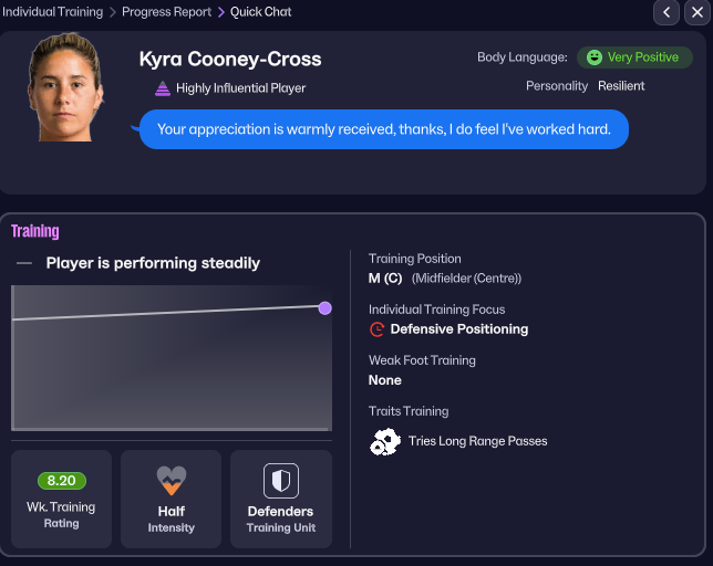An early beneficiary of my save has been Kyra Cooney-Cross, and my decision to deploy her in the advanced playermaker role in possession, was vindicated in this match. Having scored on the opening weekend, the Australian once again influenced proceedings in the final third, notching a further goal and two assists in a player of the match second half performance. As one of the most versatile players in my squad I have set Cooney-Cross on an individual training plan to improve her defensive awareness, so that I can use in a deeper role as and when required.