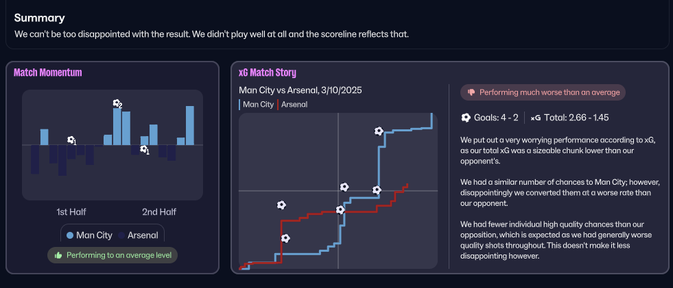 Reverting to the chaotic style of football that had produced outstanding results in the early weeks of the season, this match proved to be a case of flying too close to the sun, as City exploited gaps in my press-oriented setup in a dominant second-half performance. Two goals inside the first six minutes, one of which was scored by Vivienne Miedema, put City firmly in the driving seat. Caitlin Foord pulled a goal back on the hour, but any hope of a comeback was short-lived as Alex Greenwood scored a fourth, from the penalty spot, just two minutes later, and that was that.