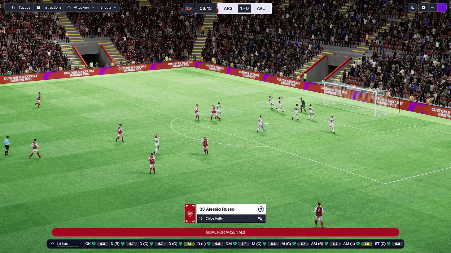 At 3-0 up, I instructed my team to control the game and slow down their passing tempo in an attempt to preserve energy and ensure gaps didn’t open up, but my side didn’t let up in any case. Like Renee Slegers in real life, I experimented with the usage of Victoria Pelova in the number 10 position, setting her role to channel midfielder in order to suit a player who enjoys picking up space in the pockets. This worked to great effect, as she came off the bench to score.