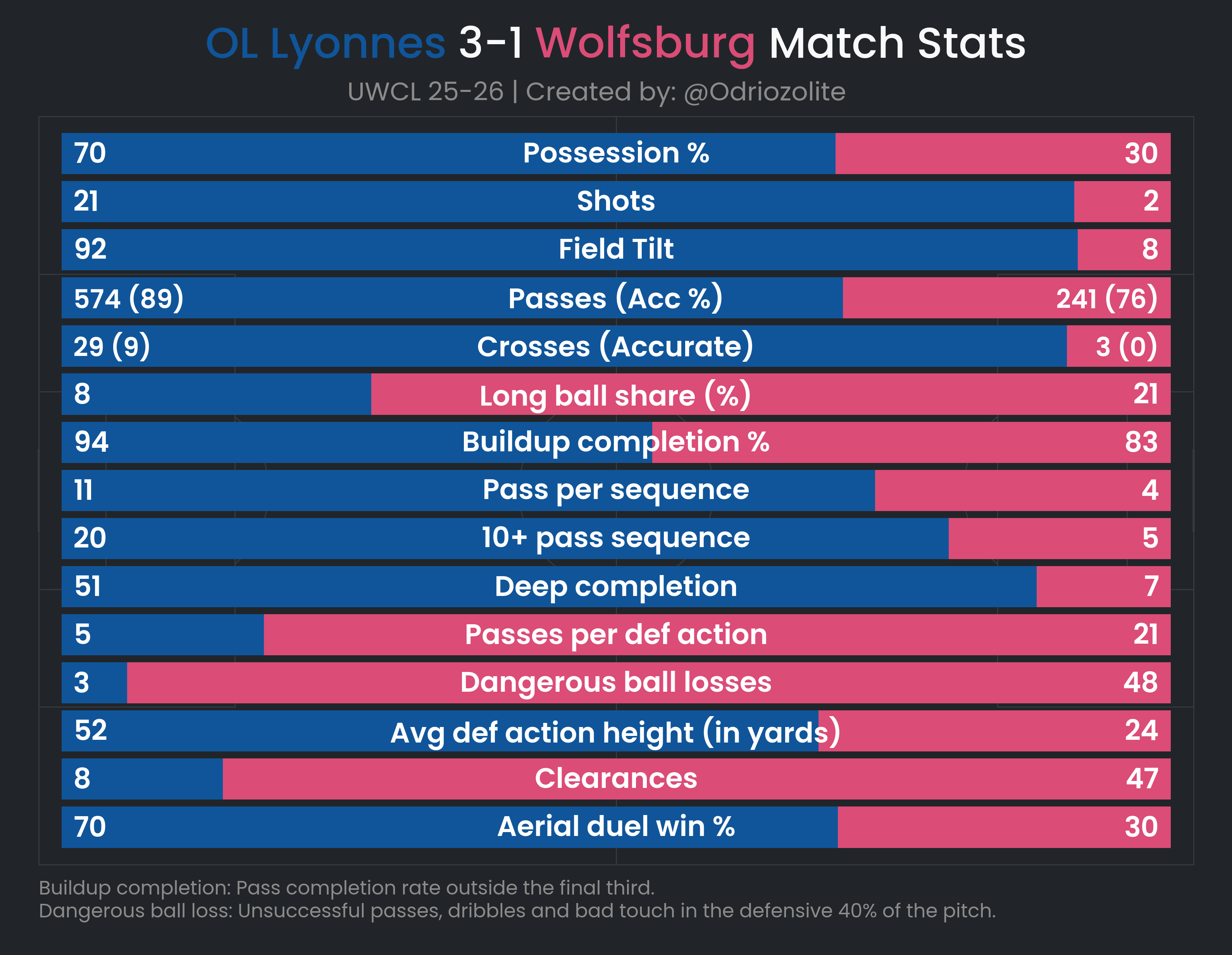Lyon monopolised the the ball with 70% possession and dominated territory with it. They had a field tilt of 92% (the share of final-third touches for each side) and recorded 21 shots, the most any side has managed against Wolfsburg in a game this season. In comparison, the She-Wolves managed two.
