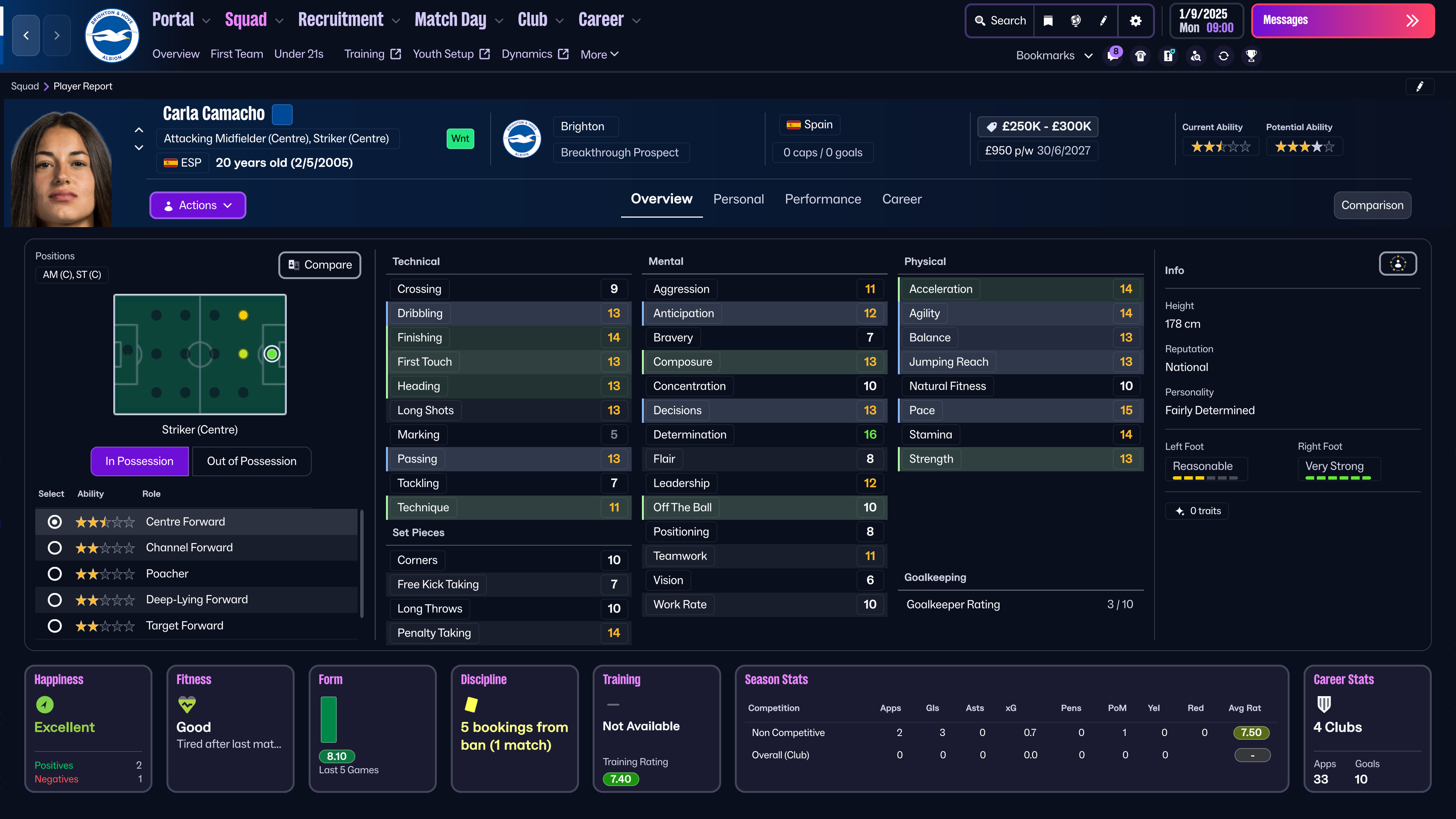 Carla Camacho is developing as a striker with very specific qualities that make her a classic presence inside the penalty box. In Spain, she has shown an ability to hold the ball up with simple touches and lay-offs, using her strength and positioning rather than refined technique. Her game is based more on effectiveness than flair, with off the ball movement, anticipation, and finishing standing out as her strongest areas.