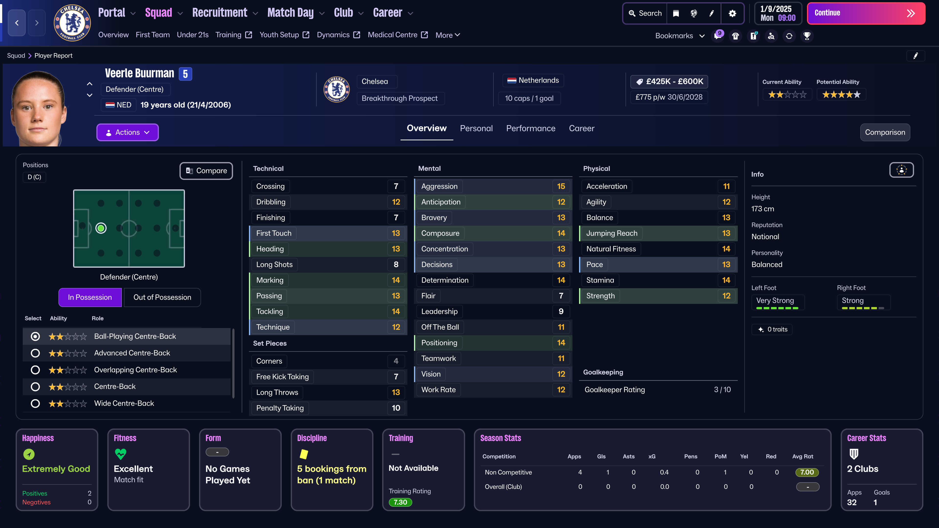 Now at Chelsea, she looks poised to establish herself as a key figure, combining solid tackling and tight marking with excellent first touch and passing. Strong in duels both on the ground and in the air, she stands out as a naturally left-footed central defender, a relatively rare profile that adds balance and variety to possession. Surrounded by Chelsea’s experienced centre-backs, she will have the opportunity to learn from some of the best in the league while gradually making her own mark. With her blend of skill, potential, and composure, Buurman is a promising addition to a team competing for domestic and European honours.