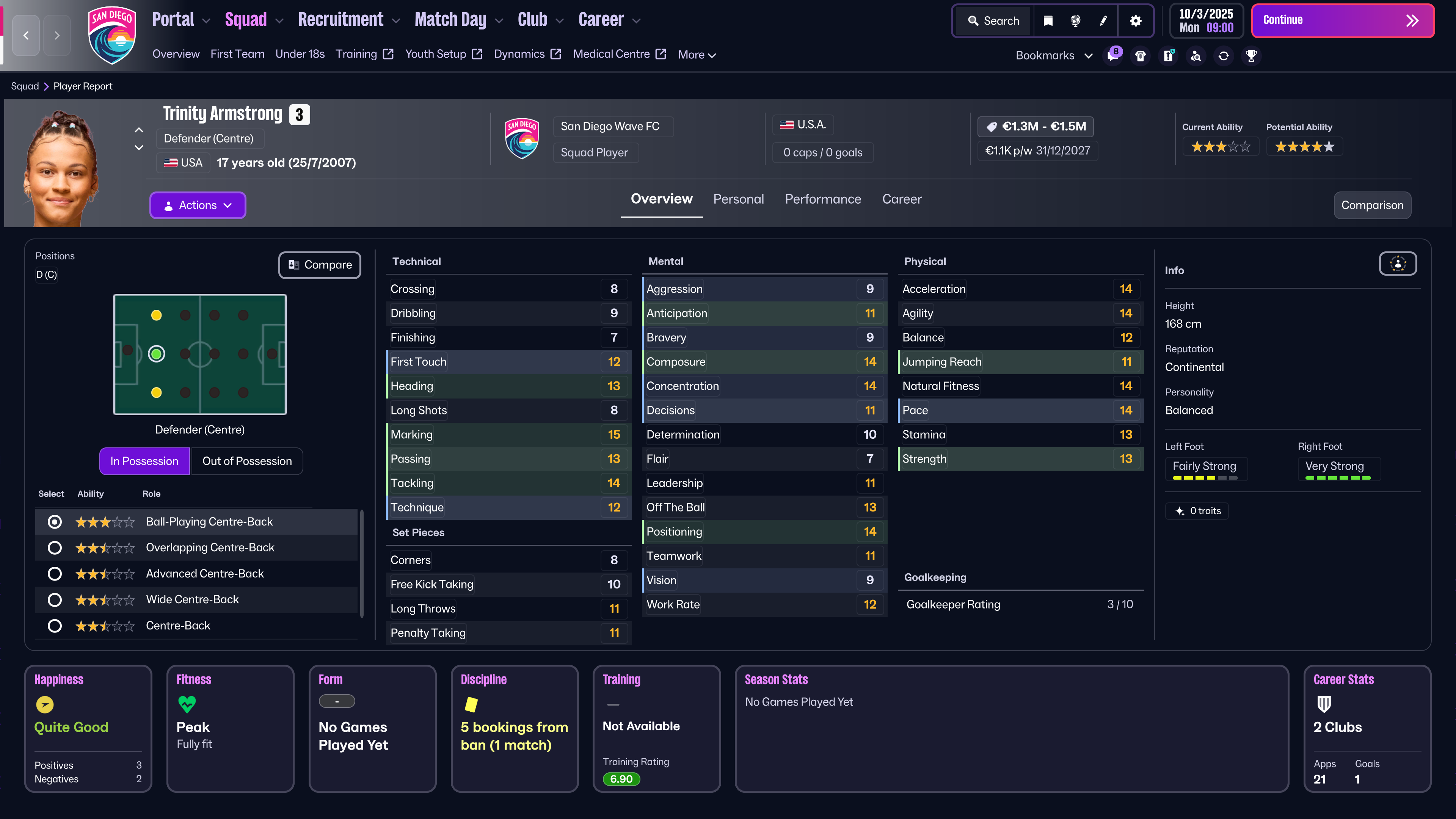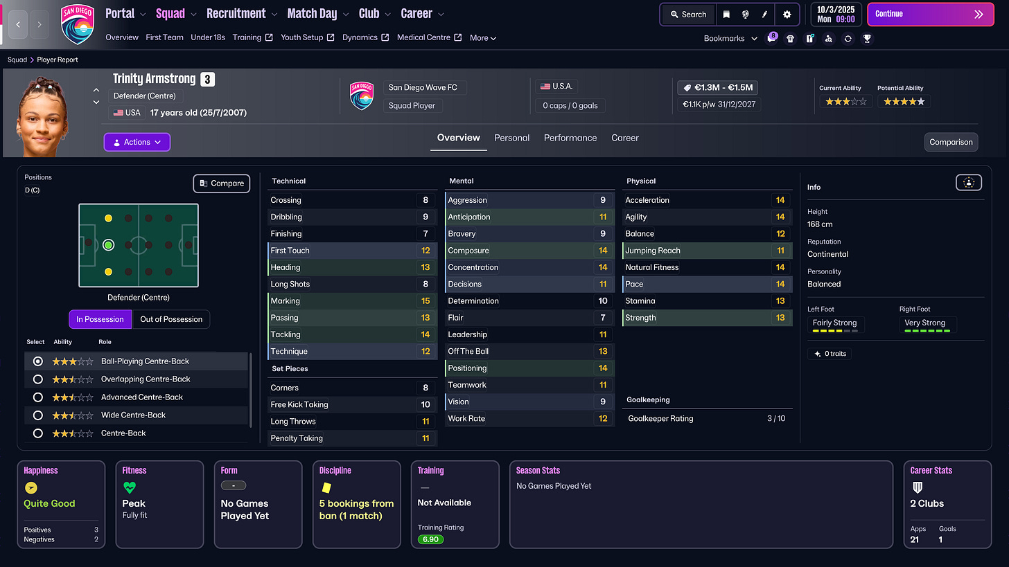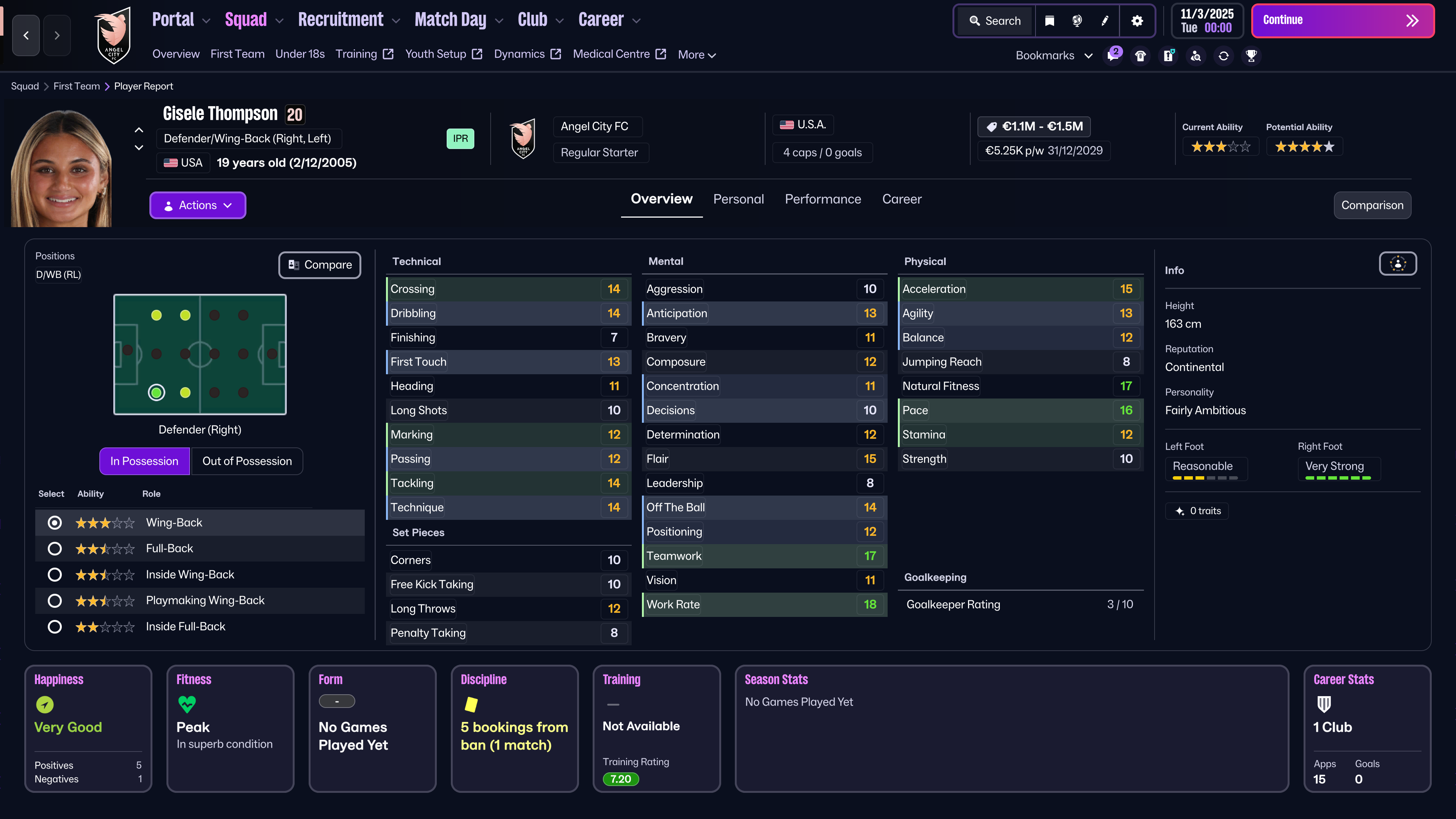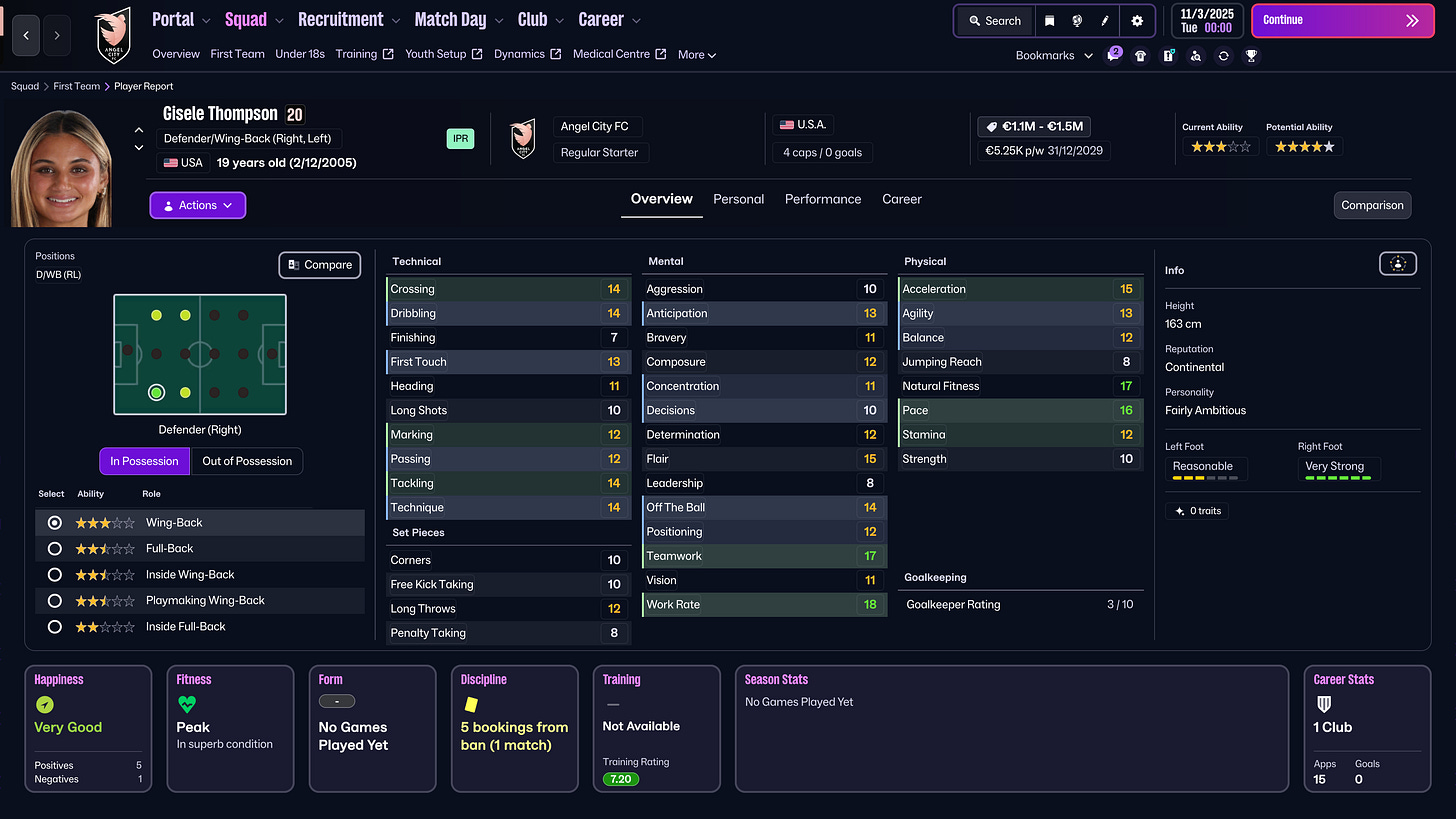 Thompson is the definition of a modern full-back: good pace, technically secure, and relentlessly proactive. Her combination of acceleration, agility, and ball control allows her to progress play with confidence, while her dribbling and crossing add value in advanced areas. She defends with determination and aggression, showing good tackling technique and balance in one-on-one situations. Physically strong and hard-working, she’s capable of maintaining intensity throughout matches. There’s still room to grow in her concentration and defensive awareness, particularly in aerial duels and positional play, but her blend of pace, determination, and technical ability makes her one of the most exciting defensive talents in the league.