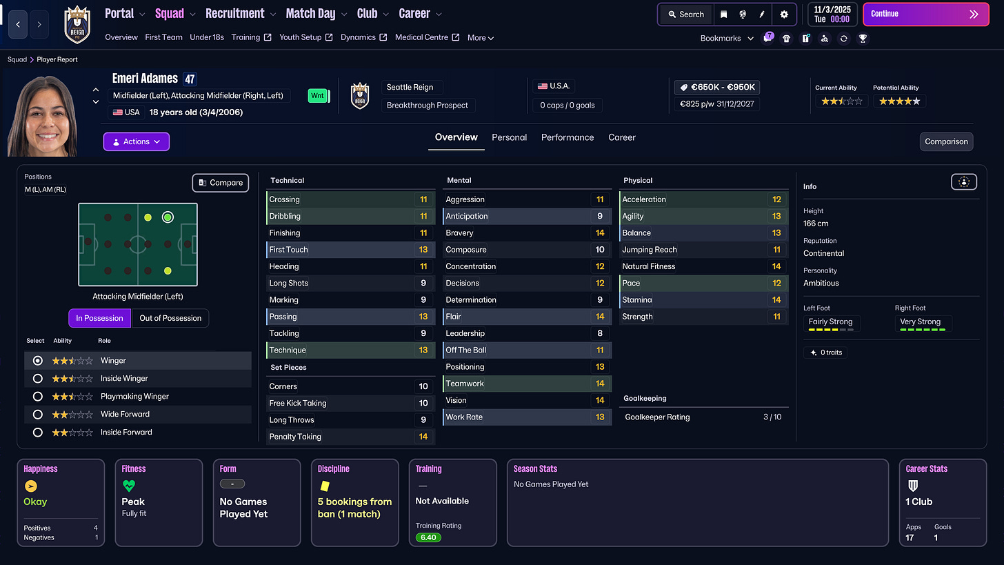 She is especially dangerous in transition and tends to thrive when given space on the wing or between the lines. Her pace, acceleration, and off the ball movement allow her to time runs in behind defenders, often catching them off guard. More scoring than passing oriented, Adames shows good finishing instincts, especially with her left foot, and is developing good composure in tight situations. While still learning consistency in decision-making under pressure and improving in offensive combinations, she already demonstrates strong confidence and flair. If she continues getting more minutes and starts, she has the profile to become a reliable attacking option for Reign and potentially for the US senior squads.