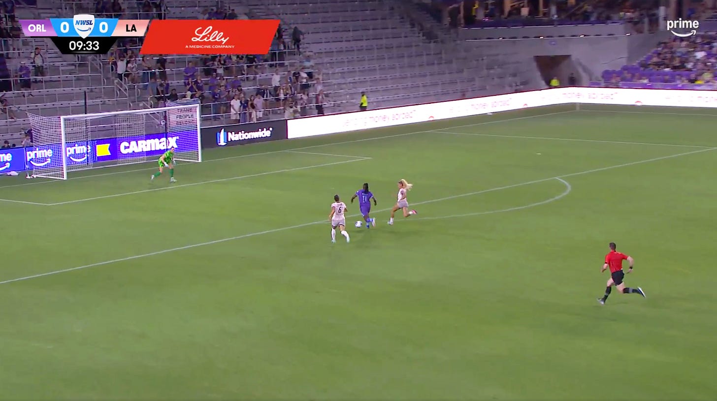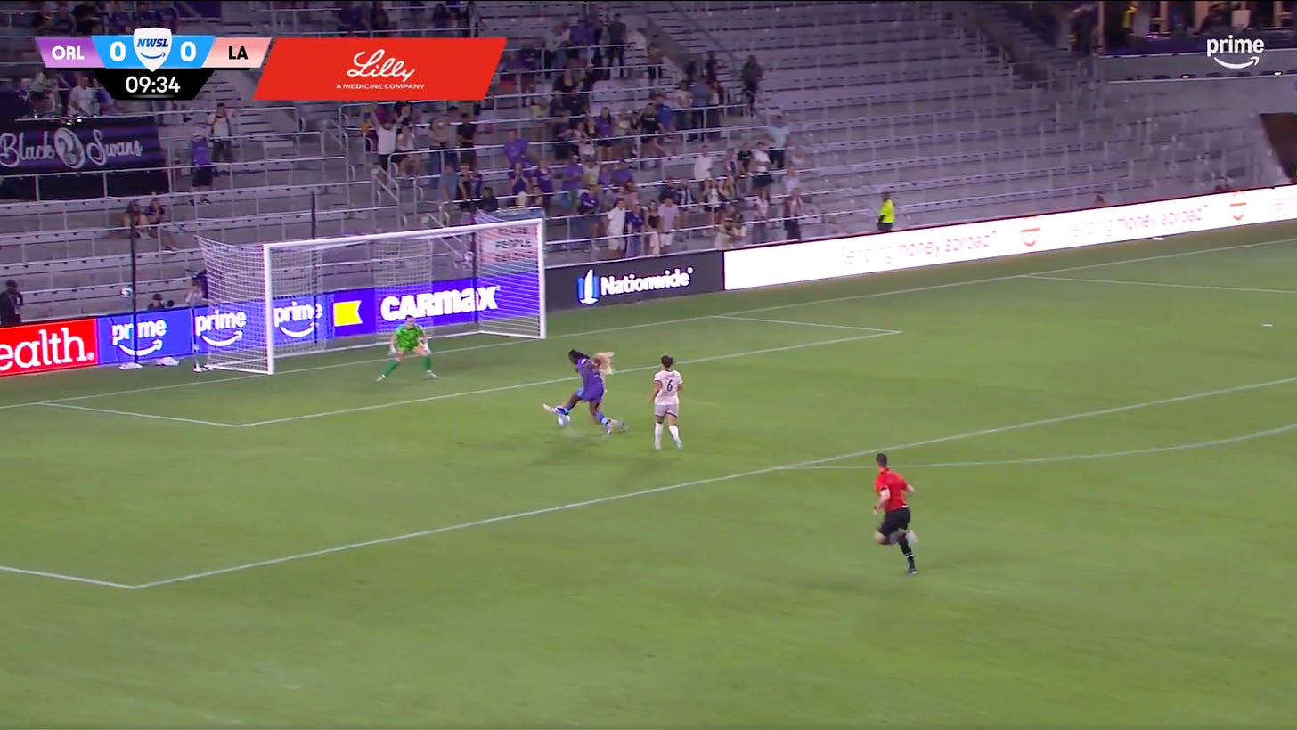 Banda broke through just once in the first half during the 10th minute when Angelina stepped up and fired a long ball behind Angel City’s centre backs, but, as you can see in the screenshots below, Gorden tracked Banda down late to deflect a chance on goal.
