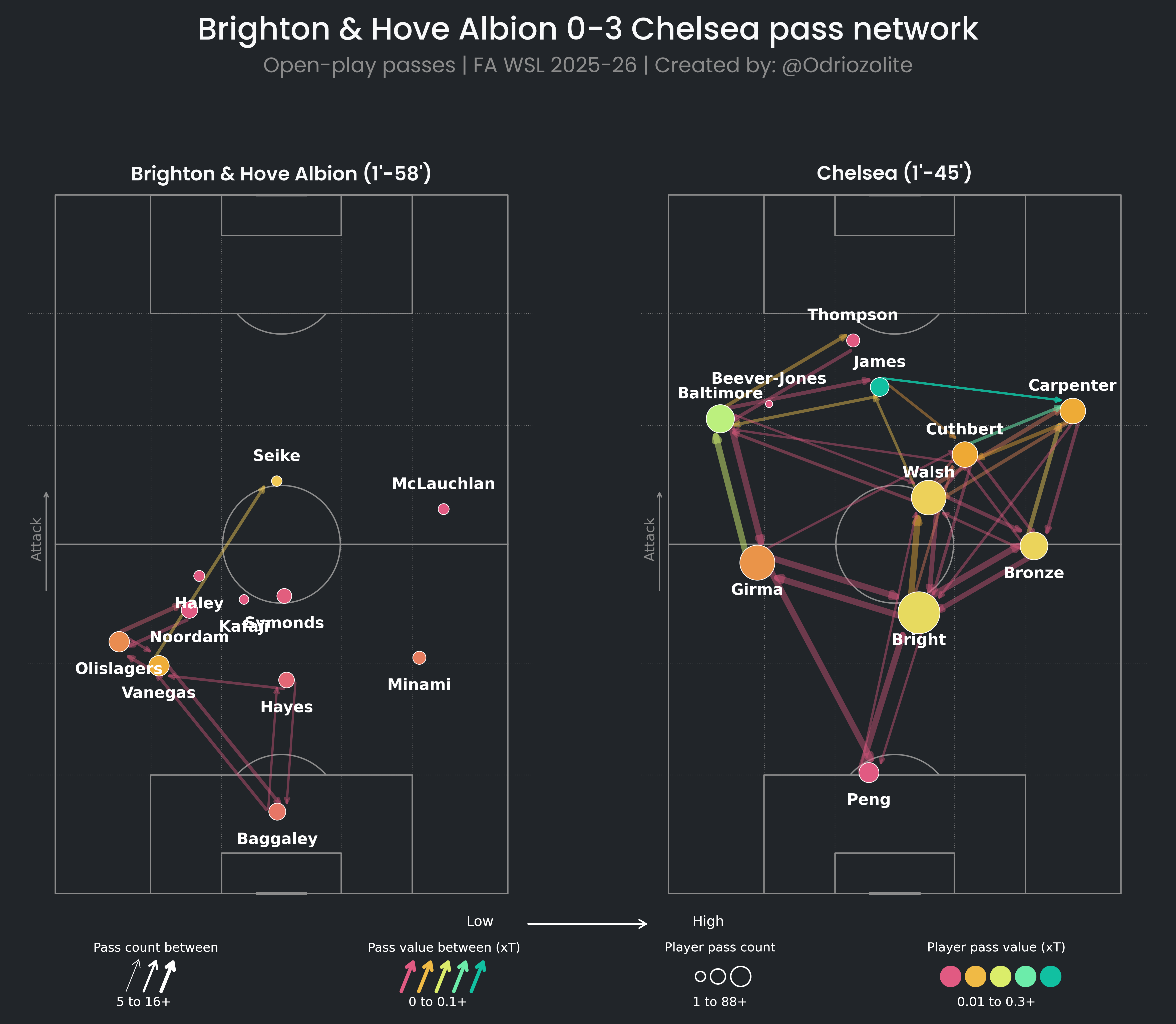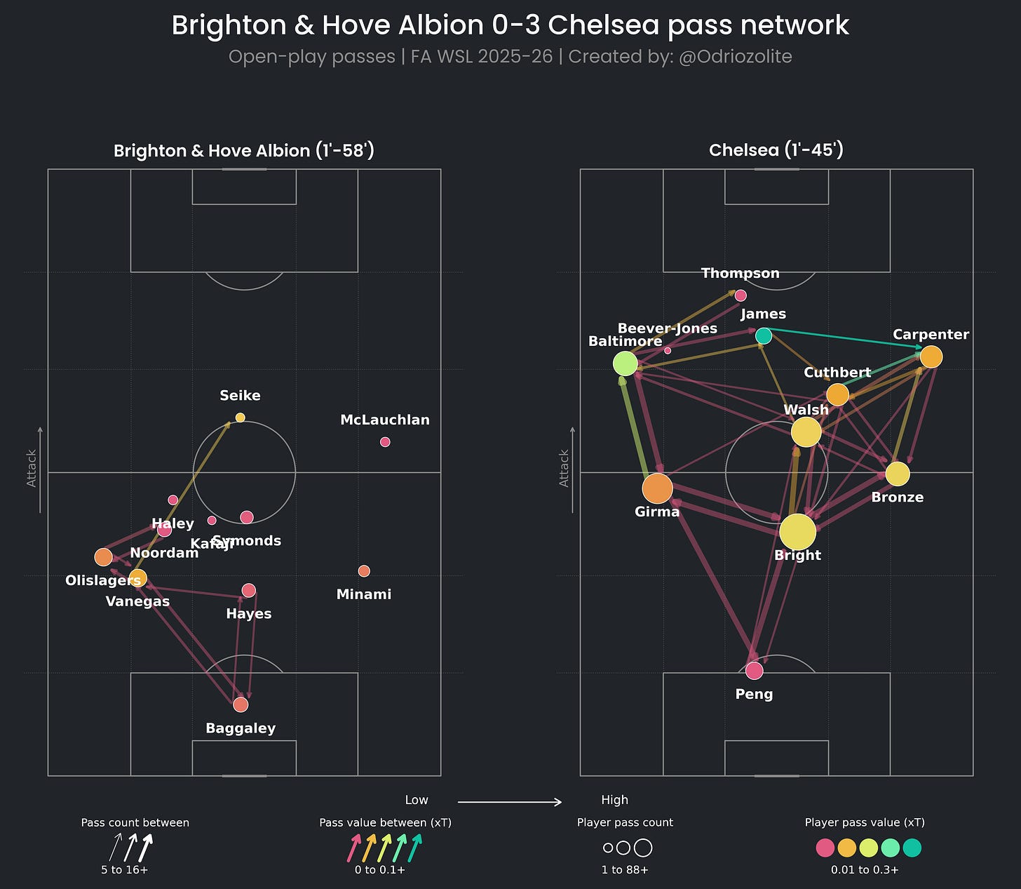Brighton struggled to generate meaningful chances, taking just eight shots in the game, with no big chances and none of them coming from inside the 15-yard zone. The Seagulls committed a lot of bodies in defence and, as a result, found their attackers isolated up front, struggling to challenge Chelsea’s back line.