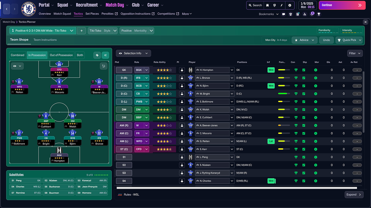 Out of possession: Out of possession, Chelsea defend in a compact 4-4-1-1, with wingers dropping into midfield and the No.10 leading the press on the opposition’s first build-up player. This role is one of the most demanding defensively, which explains the rotation between energetic profiles like Hamano, Kaptein or Nüsken in high-pressing games, and more creative players such as James or Macario against deeper blocks. Chelsea’s counter-pressing is a major strength, often producing immediate chances, as in the 2-1 comeback win over Everton.