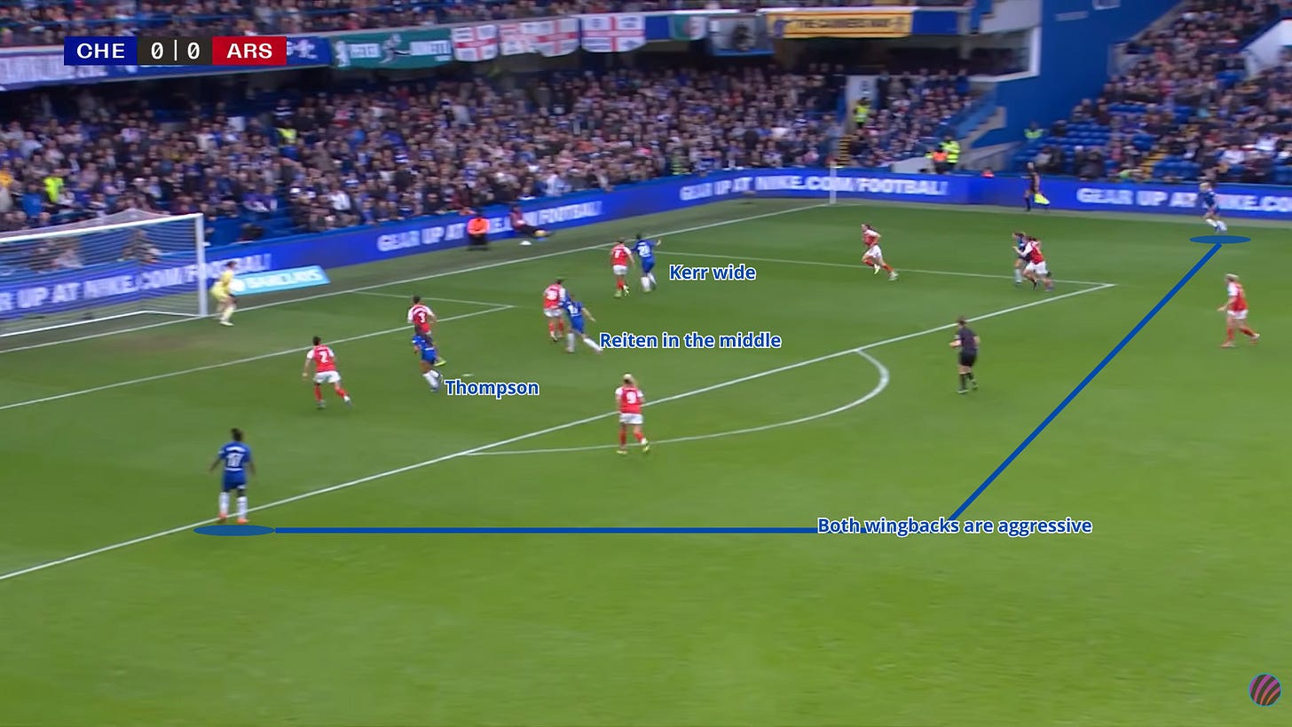 In the build-up, Chelsea aimed to progress quickly, often using the wing-backs as primary outlets. Combinations between centre-backs, wing-backs, and the near-side forward were a recurring pattern, with one striker drifting wide and Reiten arriving late into the box as an added runner rather than acting as a pure playmaker. This setup also allowed one of the double pivot, usually Wieke Kaptein rather than Erin Cuthbert, to step higher and support attacks while the other remained more conservative.